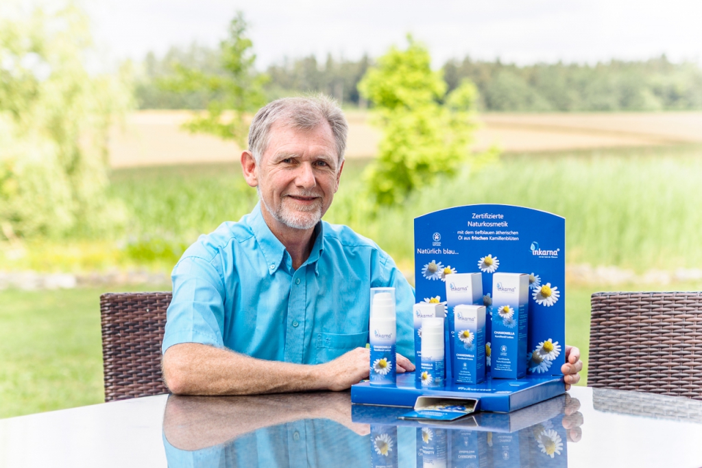 "As a pharmacist I can look back on 25 years of experience in the pharmaceutical and cosmetic industry. Amongst others my fields of activity were quality control, production management and the leadership of contract cultivation of healing plants in Germany. Unquestionably the cultivation of special crops is complex and expensive, but it is a valuable enrichment of our fields and a beneficial alternative to the rightly criticized exceeding maize cultivation in our landscape. The concept of the Kistler family was especially convincing to me. It took a lot of courage and pioneer spirit to make a project like the Lindenhof a reality and to develop a distillation technique that yields volatile oils of highest quality and purity. Everyone who sees the Lindenhof and its surrounding chamomile fields at blooming time is pleased with the magnificent sight. Soon a common idea came into being: to combine the long-term pharmaceutical and agricultural experiences and to create really superior chamomile cosmetics based on the deep blue chamomile oil with its manifold effects. We have embedded our chamomile oil in two recipes (cream and lotion) that combine quality, authenticity, environment protection and uncomplicated handling. The products are suitable for the whole family and for any time of the day or night. We lean upon certified natural cosmetic with raw materials from organic farming that stem from sustainable, eco-friendly production. I am convinced that we have created something truly special with Inkarna® products.“
